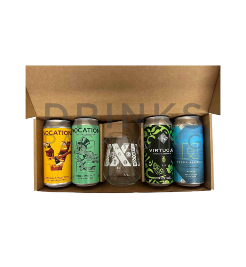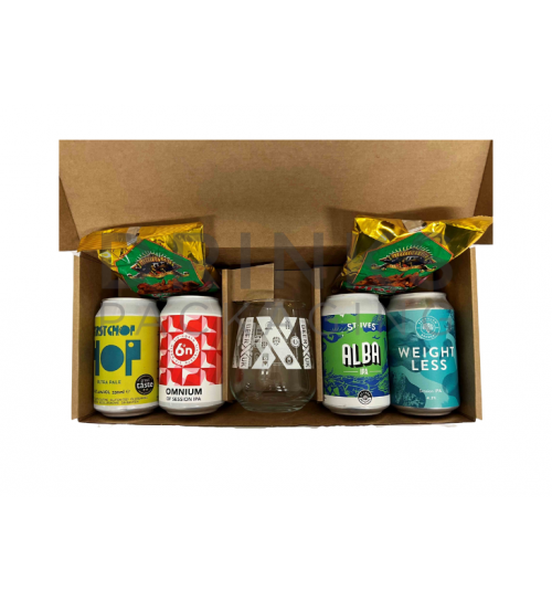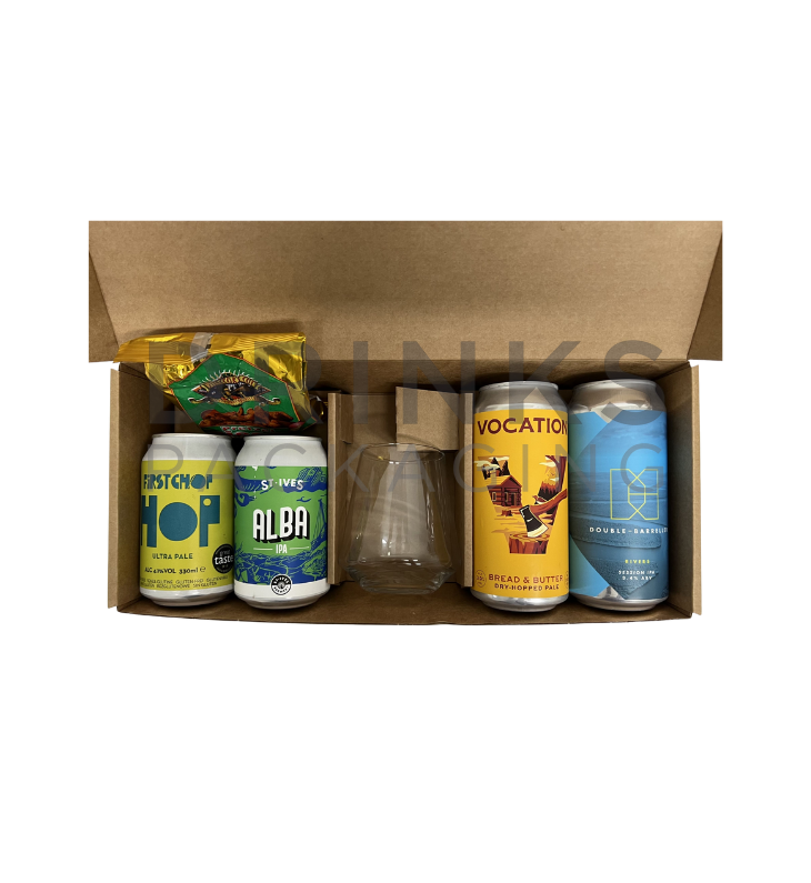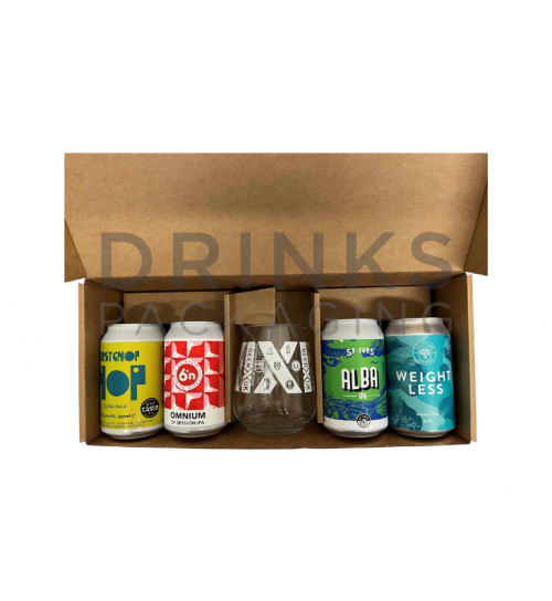 This Gift Box is suitable for either 4 x 330ml cans and/or 4 x 440ml cans plus a Mencia or Harmony glass. |